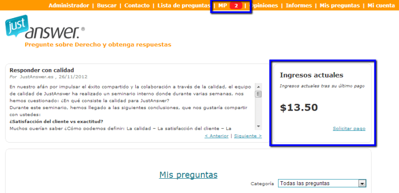 Los «Ingresos actuales» en su cuenta* estará visible en la página de «Mis preguntas». Con la intención de tener más visible el dinero que usted va ganando al mes, hemos querido mostraerle de una forma más clara y visible de cuánto dinero usted dispone en su cuenta en estos momentos.