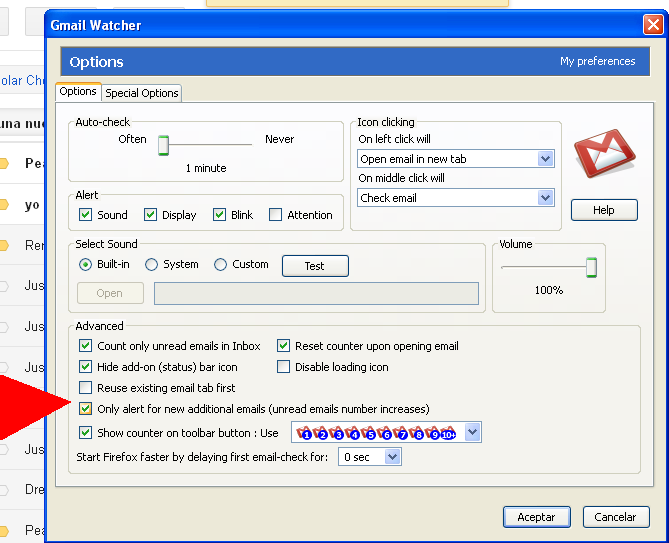Para mejorar aún más el sistema, puede hacer click derecho sobre el icono de Gmai l-el que señalizamos con la flecha roja- y elegir la opción “Check every minute” para que el programa compruebe si hay nuevos emails cada minuto. Además, puede hacer click con el botón derecho en el icono de gmail, click izquierdo sobre “Advanced options” y seleccionar la casilla “Only Alert for new aditional emails”.