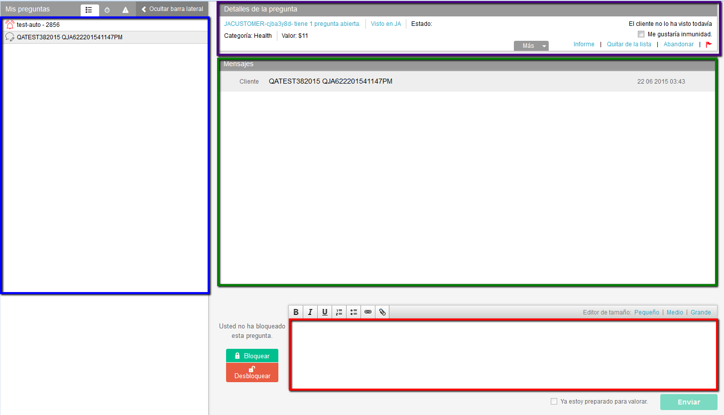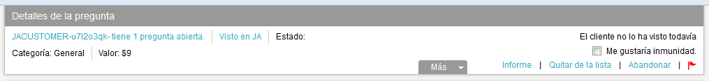La zona morada: En esta parte dispondrá del nombre de usuario del cliente que envía la pregunta, cuántas preguntas ha formulado, el estado, valor y categoría de la pregunta. Además los botones para abandonar, solicitar inmunidad y la opción de envío de reportes a través de la banderita roja.