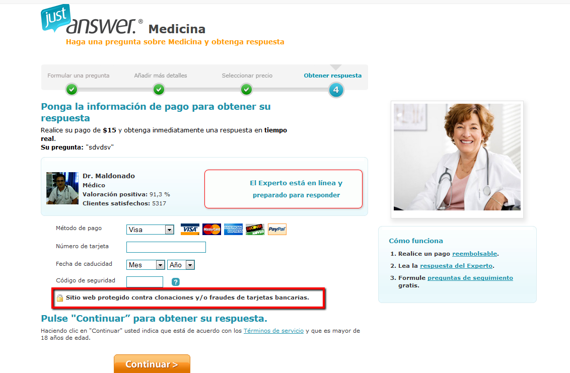 Como pueden ver en la imagen superior, hemos añadido un copy (texto) justo al lado del código de seguridad donde indicamos que JustAnswer es una web segura y está protegida contra clonaciones y fraudes. Tenemos muchas esperanzas puestas en este experimento y esperamos que ayude a mejorar la confianza de nuestros futuros clientes.