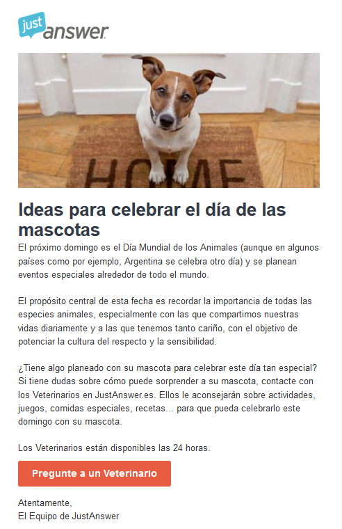 Esta semana hemos variado un poco el Email Marketing para recordarle al usuario que nos sentimos identificados con ellos y con sus celebraciones y actividades personales, nos hemos dedicado a recordar una fecha que para muchos es importante sea por el valor espiritual de la misma o bien para otros por pasar un tiempo de diversión en familia, en cualquiera que sea los casos JustAnswer.es siempre puede estar ahí a disposición del usuario.